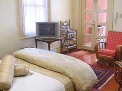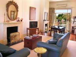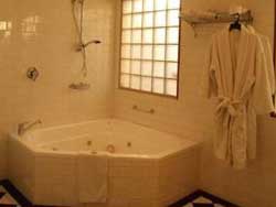 LOGGIA SPA SUITE The Loggia is a private suite with the emphasis on romance and privacy with touches of baroque accents and burnished jarrah floors. The magnificent two person huge spa bathroom with king size corner spa is flooded with light with 2 complete walls of glass opaque tiles. The bathroom is surrounded by a walled private courtyard garden with Italiate tiles, Tuscan hued walls, a lion’s head fountain and slim pencil pines. |