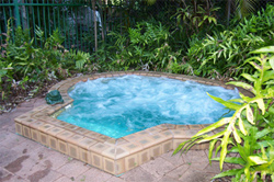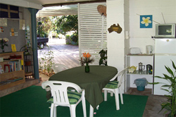 Frangipanni offers private access to a clean, fresh tropical style room and bathroom beneath our family's elevated home. Surrounded by garden and grassy lawn, indoor and outdoor living are combined to maximise enjoyment of the tropical lifestyle. As you enter Frangipanni, you will notice the fragrant frangipanni trees (from which we took our name) gracing the garden. The spacious yard is planted with native and tropical trees and shrubs, and many stately palms. Parking your car close to the entrance to the room, you will walk through the outdoor, undercover dining and sitting area. With overhead fan for cooling on our hotter days, you can view the garden and take advantage of the tropical evening breezes. Entering the room you will find a choice of air conditioner or overhead fan, a clock radio, generous shelves and hanging space, a queen size bed and a single bed. Tea and coffee making facilities are available with electric kettle and a toaster on hand. Across the dining area lies the private bathroom, comprising shower, vanity unit and toilet. Walking out into the large backyard will reveal an expanse of grass and tropical gardens, including several fruit trees. Nestled among the ferns and palms is a spa which is available for your use. There is a fridge, television, DVD player,small microwave, ironing eguipment and gas barbecue. Laundry facilities can be made available on request. Your room will be serviced weekly. On one side is the bedroom and on the other is the bathroom and laundry facilities. To the front is the pedestrian access and carpark, whilst at the back there is access to the garden and spa. |