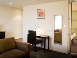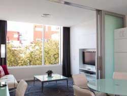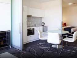 ROOM TYPES DELUXE ONE BEDROOM Chic and sleek, 5 Star 1 bedroom apartment with king bed. Living area boasts 106cm LCD flat screen television, DVD and IPod connectivity, 11 foxtel channels, free wireless internet access, beverage centre and snacks, self-contained kitchenette. |