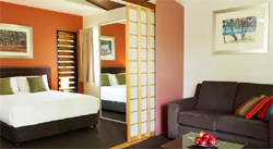 RESORT SUITE The perfect size for families or friends, the Resort Suite features a queen bed in the master bedroom and a double foldout sofa bed in the separate lounge area. Each has its own flatscreen LCD TV with free-to-air & Austar channels. High speed internet is available in each room. The kitchenette is semi self-contained with tea & coffee making facilities and the private balcony or patio overlooks the resort pool, making this the perfect luxury Darwin accommodation. |