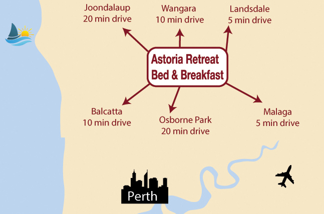 Welcome To Astoria Bed and Breakfast If your ideal location is the Perth Metropolitan area but you don't want to deal with the hustle and bustle of the inner city, Astoria Bed and Breakfast is the perfect choice for you. Nestled in a suburban setting, it is just a 20 minutes’ drive from the CBD and has direct links to both airports (15 minutes). Astoria Bed and Breakfast is the ideal place to stay for those seeking sophisticated, modern accommodation that is an alternative to a hotel. |
