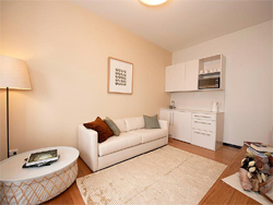Renovated in 2014, the main bedroom has sliding doors that open up to the view so you can wake up to the sunrise. The second bedroom has a view of the park and is located next to the bathroom with a full sized bath, heated towel rails and heated stone floors. The fully equipped kitchen and side balcony overlook the ever-changing view of maritime life. |