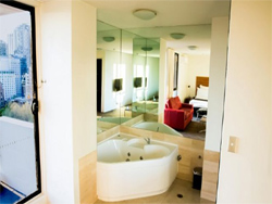 Deluxe Spa Room The Deluxe Spa Room features complimentary tea and coffee making facilities, radio/alarm, televisions, complimentary cable TV - 8 selected channels, direct dial ISN/STD phone, minibar. All beds feature triple sheeting and both European and regular pillows with European Duvets. All bathrooms boast oversized mirrors, and hair dryers. A special feature of this Spa Suite is our corner spa for two to complete your romantic getaway. |