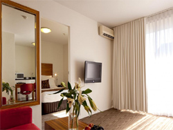 One Bedroom Deluxe Perfectly suited to families; our spacious One Bedroom Deluxe Suites feature separate bedroom and living areas. The living area features a double sofa-bed, while the separate bedroom boasts comfortable Queen bedding. Complimenting the family-oriented design; make the most of our additional kitchenette; featuring a microwave and self-catering facilities. Enjoy complimentary tea and coffee making facilities, radio/alarm, minibar, televisions, complimentary cable TV - 8 selected channels, and direct dial ISN/STD phone. All beds feature triple sheeting and both European and regular pillows with European Duvets. Our bathrooms feature oversized mirrors and hair dryers. |