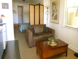 The building that houses the two studio apartments was originally the Jones Family Hotel, built in 1884. Now it is a mix of residential and commercial premises. The two apartments are in the back of the building, accessed through a side gate into a courtyard with a beautiful jacaranda tree. The two apartments offer similar facilities. The apartments are next door to each other. The Artist's Studio is the larger apartment. It has a king sized bed that can be configured as two singles, and a single sofa bed. It has a dining table. The Writer's Den has a queen sized bed and a single sofa bed. Both apartments sleep three people. |