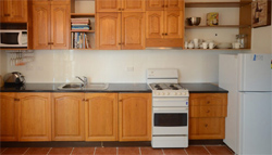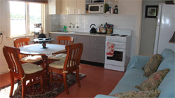 A spacious ground floor apartments & has two queen size bedrooms with double sofa bed in living room. Sleeps 2-6 guests. Large living/kitchen area is carpeted with separate tiled dining room & partly covered deck overlooking large native garden with outdoor setting for six. Fully equipped kitchen with full stove, microwave, toaster, electric jug, coffee makers & cooking utensils are supplied. Natural gas heater & ceiling fans in living/dining area |