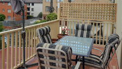 Fully equipped kitchen with gas cooker full size fridge, microwave, crockery, cutely etc. Bathroom has a bath tub & shower, hair dryer, with automatic washing machine & dryer. Iron & ironing board are supplied. Bedroom has a king bed & built in wardrobe, clock radio. Digital TV in living area with double sofa-bed. Veranda has district view & outdoor setting for six. |