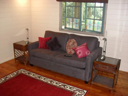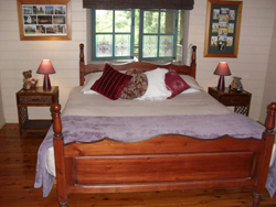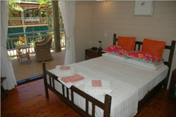 Queen Rooms The buildings here are all built in that unique Queensland timber pole style, and have queen size beds and are fully ensuite, with ceiling fan, free-standing fan, fridge, alarm clock, hairdryer, a teddy bear, and of course complimentary toiletries. The shower is a nice big size with shower door - not one of those horrible shower curtains. The doors and windows are fully screened. We can add an extra bed to sleep an extra adult or child, but the King Suite is much better suited for three people. |