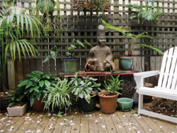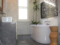 | The upstairs gallery room is 35 square metres with a stainless steel queen four poster bed and has a comfortable sitting area. It also looks out over the front garden and has a collection of life drawings, paintings and prints. This room has a generous sized ensuite bathroom. The upstairs front room is 27.5 square metres, has a queen four poster bed and a sofa that can be made into a three quarter bed. This room looks out across the verandah to the leafy front garden. The out back upstairs room at 30 square metres, is very light and airy and has sweeping distance views from the south western suburbs across to the ridge line of the Royal National Park. It has a modern queen bed and is large enough to include a small sitting room. Both these rooms share a beautiful marble bathroom. |