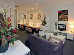 The apartment is very spacious and accommodates 5 people comfortably with King Bedding in the master room and 2 singles in the second bedroom and a single bed in the third bedroom. The apartment is fully self contained with a modern kitchen, 2 separate bathrooms and internal laundry facilities. It also has reverse cycle air conditioner, foxtel cable TV, direct dial telephone and wireless broadband internet which is available through Tomizone. The Waldorf Lounge offers a complimentary light breakfast every day and a relaxing environment throughout the day. All linen is provided for the apartment and a weekly maid service for stays of 7 days or more. Secure onsite parking is available at an additional cost. The apartment is suitable for both short or extended stay accommodation. |