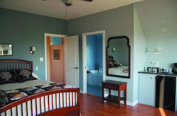 The master bedroom has a slanted roof so typical of island farmhomes.
