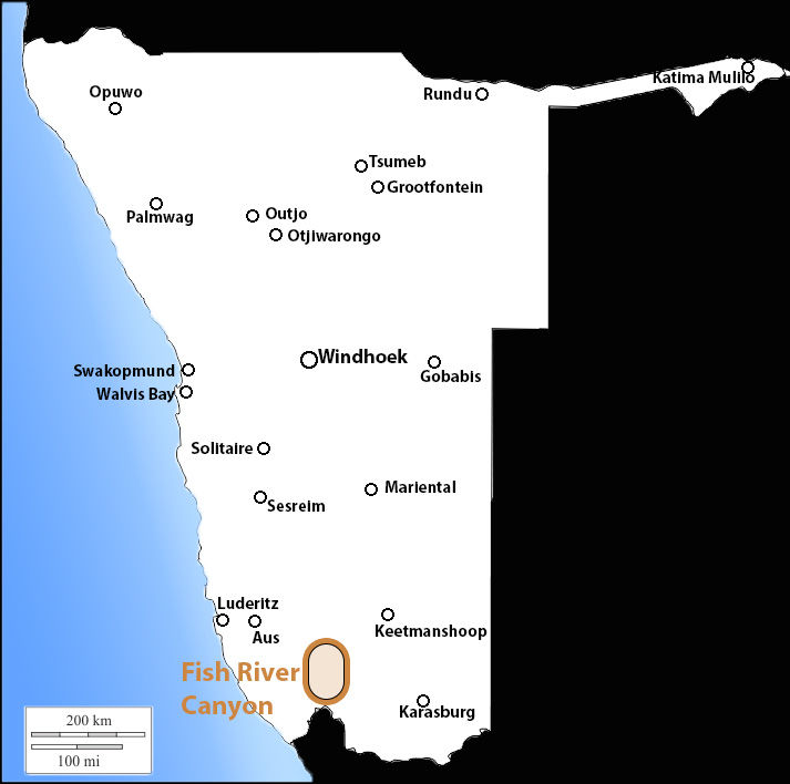 In the far south of Namibia is the Fish River Canyon, the canyon is approx 160km (100miles) long and the river it is named after, the Fish River, is 650km long making it Namibia's longest river. The river flows intermittently, usually flooding in late summer; and when it ceases to flow it becomes a chain of long narrow pools on the sandy rock-strewn floor of the chasm