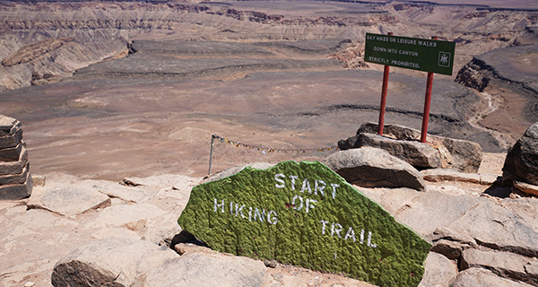 The descent starts at Hiker's View, about 3 km north of the Main Viewpoint and takes almost an hour. Only one "emergency exit" leads out of the gorge near "Palm Springs", to which one usually arrives at on the third day. It is a very steep path and once you get to the top, you literally stand in the desert. The trail ends in Ai-Ais. he Fish River canyon, situated along the lower reaches of the Fish River, is one of the most impressive natural beauties in the southern part of Namibia.