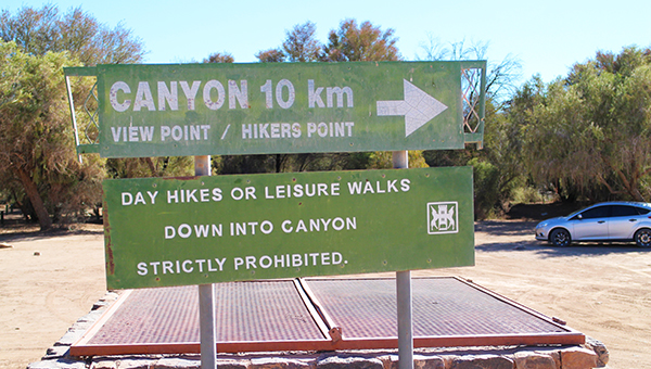 The gate is situated at the restcamp Hobas. From there, you have to drive another 10 kilometres to the actual Canyon which offers a stunning view of "Hell's Bend".