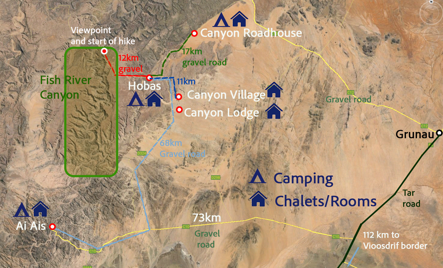 At the lower end (south) of the Fish River Canyon, the hot springs resort of Ai Ais provides an oasis in the desolate rocky wastes with Ai Ais Resort offering rooms and camping. At the north is where the Fish River Hiking trail starts and this is where Hobas Camp is located. The canyon is part of a Nature Conservation Park.