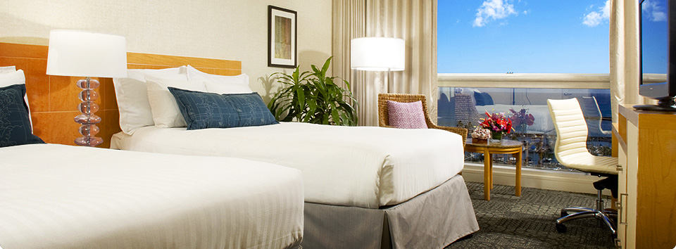 | Oceanfront Rooms All hotel rooms are oceanfront with floor-to-ceiling windows that feature breathtaking views of the Pacific Ocean and Yacht Harbor. Recently refreshed, these luxury accommodations in Hawaii reflect an island sense of place with island inspired weaves, textures and motifs with a contemporary twist, specially designed bed décor, Hawaiian kapa patterned carpeting, artwork featuring local artists and new furnishings. Enjoy a spacious oceanfront room with floor-to-ceiling windows, flat-screen television, available high-speed Internet access and One King or Two Double beds. |