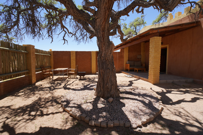 The Desert Horse Inn has 4 individual farmhouse rooms which are old and part of the original farmhouse building. These bedrooms all share an outside sitting area, in front of the rooms, with lots of shade provided by a large tree.