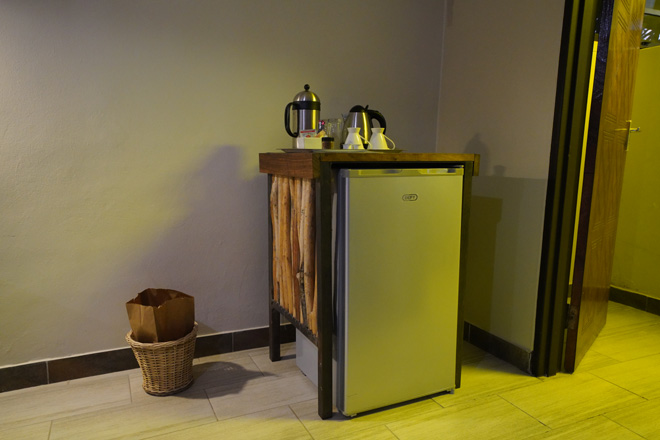 The fridge and brew station combo adds a touch of convenience and charm to your Etosha Village experience.