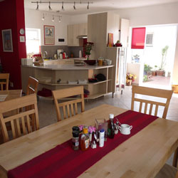 Meike's Guesthouse has five double bedrooms, furnished with 2 extra-long single beds, which can be converted into a large king-size bed. The rooms have en-suite bathrooms with walk-in showers. Toiletries and hairdryers are provided. All rooms have a private terrace with outdoor furniture and a view over the courtyard garden.