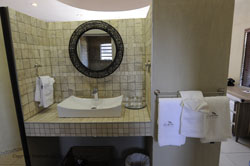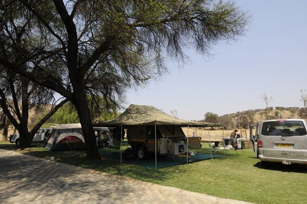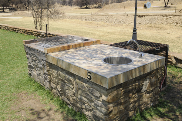 The luxury self-catering campsites are complete with private toilets and separate showers. Each campsite features a food preparation area, washbasin with warm water, and a built-in braai area on a veranda for meal times and outdoor cooking. Electricity, provided at 220v, is available in the kitchenette area. Additionally, campers enjoy full access to the boma restaurant and swimming pool facilities at the main site.