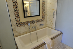 The marble bathroom a separate bathtub and a multi-jet shower.