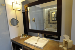The en-suite bathroom boasts a walk-in shower and bath, double vanity, and premium toiletries for a lavish experience.