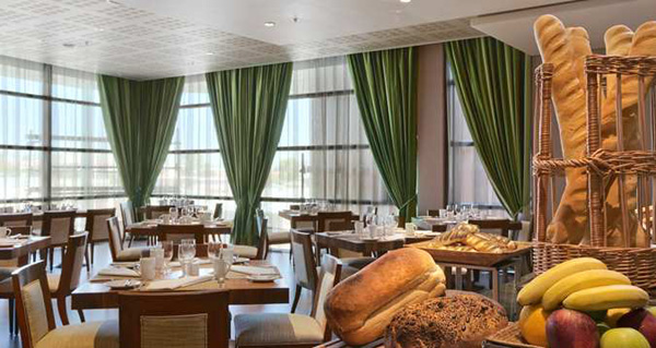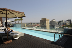 The hotel boasts impressive architecture, offering city views from its Skybar, terrace, restaurants, and wine cellar.