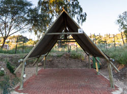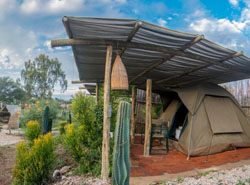 The Explorers Delight Tent at Urban Camp in Windhoek, Namibia, accommodates up to 2 people in a King Size Double Bed or twin beds. Prices vary by season.