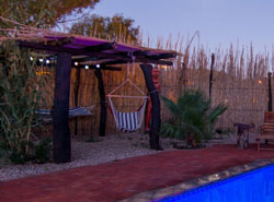 The site features large, shady trees, Wi-Fi internet access, en-suite bathrooms, and a sparkling swimming pool.