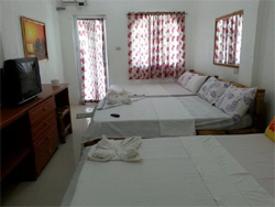The family room has a maximum capacity of 9 persons. It is ideal to be enjoyed by a group of friends or a family. It has 4 double beds and comes with cable TV, air conditioning, refrigerator, hot & cold shower & free WiFi access.