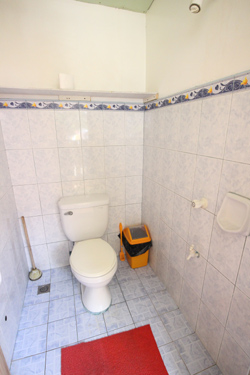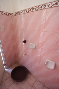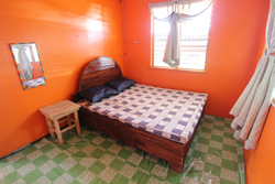 Rooms are simple with a bed and fan and a shared shower and toilets. |