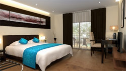 Our spacious 28 sq. m. Deluxe Room Pool Access allows guests entry to the pool from the comfort of their own veranda. Available in queen or twin room, it features modern décor, soothing warm colors, beautiful dark woods, plush duvets, pillow-top mattresses, and ample luggage stowage area. |