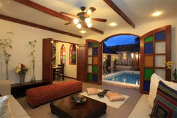 4 floors of private space all for your party. Queen-sized beds in 3 Bedrooms sleeping 6 persons. Additional beds may be requested to sleep up to 10 guests. Your own private pool, wet bar, living room and kitchen make for a truly special stay. |