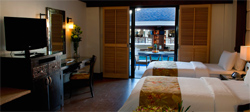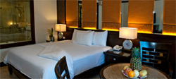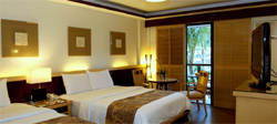 The stylishly designed Deluxe Rooms at Henann Lagoon features over 28 square meters of space and are located on the 2nd to 4th floors of the resort with a balcony offering views of the resort's massive lagoon.Each room, designed to give guest the best value for money, has a bed configuration of one single and one queen-sized bed, and is furnished with an LCD TV and 300 thread-count duvets. |
