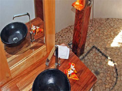 The neat, stand alone villas have a half open, half round and modern bathroom,