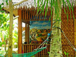 materials. The resort's private generator supplies part time electricity (220V, 60 Hz) to the restaurant at daytime and now even during a couple of hours in the day, while the island's generator supplies power to the whole resort from 6:00 pm to 12:00 midnight. Solar lamps illuminate the resort at night.Estrella (Babie) Zagorski, owner of the resort, has an exotic garden, which prides itself of a wide variety of flowers and Orchids, ornamental and herbal plants and trees. She grows her own Bergamot, Ginger, Galangal, Basil, Lemon grass, Turmeric and plenty of Aloe Vera. |