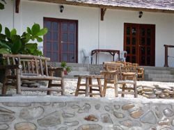If you walk down the stone staircase leading to the sea you will first come across a separate shower and toilet area for the swimming pool so you needn’t get water inside the house and you can shower straight after you get out of the warm sea. You will see that it is beautifully decorated with the pebbles from the beach to create a perfect design. As you continue down the steps you will then come across a large wooden decking area perfect for sunbathing or picnics as it is directly opposite the sea. |