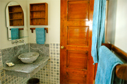 Local carpenters built all of our doors, windows and furniture employing natural joinery techniques, using legally harvested Philippine Mahogany from the nearby Nabas plantations. The hand shaped and fired terracotta terrace tiles come from the small village Lezu (a jeepney ride away). Craftsmen in Numancia made our Capiz (translucent shell) windows. Specialized artisans here on Boracay carved our exposed pillars in white sand cement. And the island you can see in the far distance, across the Sibuyan Sea? That is Romblon. It’s made of marble. A day and a half of mountain biking and bangka boat ferries got us to the quarries, where we sketched out our bathrooms and kitchens. True, it would have been easier to order everything from China or Manila, but we wanted a place that, in the end, felt like it was made, by individuals, not manufactured in some distant industrial estate. We hope you find it as pleasant as we do. |