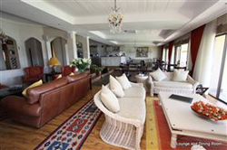 Large glass sliding doors lead out onto a verandah and lawns bordering