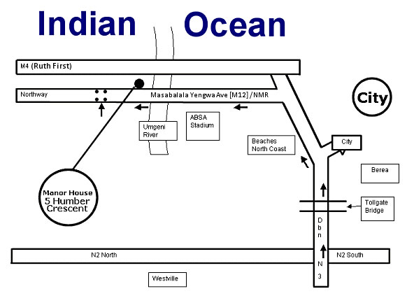the bridge till you see Riverside Hotel. OR FROM GAUTENG/PIETERMARITZBURG [N3] Continue over the bridge and see the Riverside Hotel on your right and KFC up the hill on your left. Turn right into Humber Crescent. at 1st traffic light, proceed around 2nd corner to Manor House and press buzzer at gate for reception on your right.