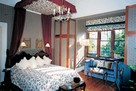 double sleeper-couch, a Victorian fireplace and a Bay window overlooking