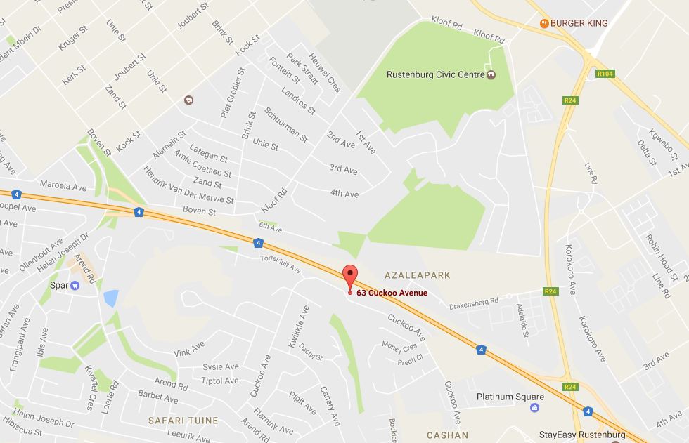 Address: 63 Cuckoo Avenue, Safarituine Extension 8, Rustenburg, 0299 North West Province, South Africa