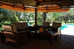 out onto a sparkling swimming pool, overlooking a waterhole where game