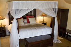 area from the bedroom, the king-size bed is draped with a mosquito net.