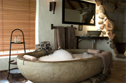 The chandelier above the stone bath can be dimmed for those romantic evenings;