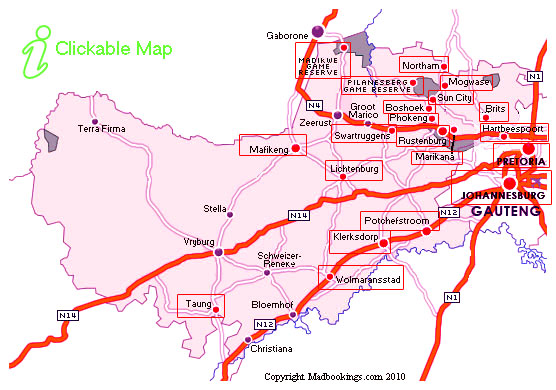 This bold,big sky terrain stretches over 116,000 square kilometres and narrates in its vast sweep the enchanting tales of prehistoric hominids, war heroes and literary greats. There is the glitter of Sun City, the historic route of Mafikeng and prolific game viewing to be enjoyed in any one of its 13 game parks.