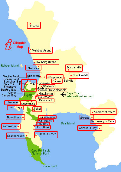 Table Mountain is the instantly recognizable symbol of the city of Cape Town and provides endless opportunities for adventure. Hike up the mountain via the many trails that criss cross its slopes, relax on the summit and enjoy the unparalleled view of the peninsula before descending Table Mountain in the rotating cable car. Kirstenbosch, the renowned botanical garden on the eastern slopes of Table Mountain is a wonderland of local flora and fascinating historical charm. Quiet pools and ponds shaded by towering oak trees and endless lawns compete with the beguiling attractions of the Colonels Bird Bath, the cycad ampitheatre, Lady Annes bath and the medicinal garden for visitor admiration. The gardens also boast a number of restaurants and tea rooms. The citys beaches attract people from September to June The ever fashionable Camps Bay, Clifton and Llandudno on the Atlantic seaboard are the perfect sundowner destinations for enjoying a sandy picnic or a decadent cocktail at one of the many trendy sidewalk cafes and bars. During the day the beaches are the preserve of the toned and the tanned where many a bikini top has been discarded in the quest for all over bronzing. Along the False Bay coastline on the other side of Cape Town, its all about old-world charm and a change of pace. The beautiful Railway House clock tower in Muizenberg beckons patrons to enjoy the culinary and musical delights at Fogeys, the stately homes overlooking the sea at St James whisper secrets of a bygone era and the retro glamour of Kalk Bay invites visitors to relax a while in the numerous bistros, delis and restaurants. The coastal road wanders on to Fishhoek and Simonstown, where the Jackass Penguin colony at Boulders Beach is a must visit. A wooden boardwalk winding through the penguins breeding ground gives you a unique vantage point from which to observe these quaint sea birds and the sheltered beach affords even closer contact with the tuxedoed charmers that swim with bathers and waddle amidst the sun worshippers. A few kilometres away the Black Marlin at Millers point is a delightful culinary detour on the way to Cape Point - the most South-westerly point of Africa where the Indian and Atlantic Oceans meet. Take in the vista of False Bay and marvel at the majestic cliffs - some of the highest in the world at 249 metres above sea level. The Cape Point National Park with its many walks and hiking trails, tidal pools for relaxing bathing and striking sea life is a nature lovers paradise, attracting hikers, snorkellers, divers as well as the visitor who simply is delighted by the natural beauty. From snorkelling to surf, the board-riders paradise of Misty Cliffs and Witsand drop off from the road that snakes along the mesmerisingly blue sea from Scarborough to Kommetjie. Visit Mokwena the only black rhino on the Cape peninsula at the Solole private Game Reserve in Kommetjie and don't leave without sampling the delectable food at the restaurant overlooking a game watering hole frequented by lazy buffalo, buck and birds. Drive on to Noordhoek where it's well worth braving the wind on Long Beach to be able to reward yourself with a drink and pizza, before continuing along Chapmans Point and on to Hout Bay with picturesque bends boasting some of the most spectacular views in the world. At the fot of Chappies - as it's fondly called by the locals -enjoy a laidback seafood feast at Chapmans Peak Hotel or idle at the waters edge before taking a long digestion enhancing stroll along the lovely Hout Bay Beach. Heading back towards the Atlantic seaboard, youre suspended between shimmering sea and towering rock as you drive over Suikerbossie and along the foot of the majestic Twelve Apostles Mountains.