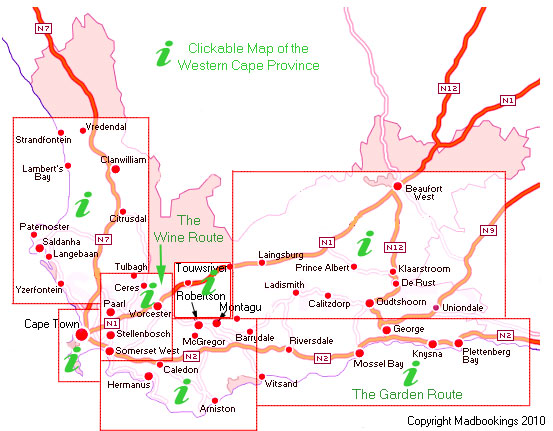 Hill is another treasure celebrating the Capes Malay heritage. Victoria & Albert Waterfront The Wineland Routes: History, culture, cuisine and adventure come together in these regions where a day could start off with a dawn hot air ballon flight from Paarl over the Berg Valley continue with breakfast then stroll in the wild flower garden beneath the majestic Paarl Rock, a short drive to Franshoek for lunch in one of the gourmet capitals world class restaurants - the Inspiring view at La Petite Ferme, the cellar charm of Haute Cabiere, Reubens laid back chic and Chamonix's faultless cuisine would make choosing a dining venue exquisite torture.... After lunch a visit to Huguenots Fine Chocolate in the high street would be in order, followed by some French cheese shopping at the La Cotte specialist wine and cheese store. An afternoon siteseeing from a mountain bike or horse back is the perfect way to explore the valley and surrounding mountains. Great hiking trails, paragliding, golf, fly-fishing and 4x4 trails are just some of the attractions on offer in Franshoek. The perfect wineland day could be rounded off by a culinary and cultural adventure in Stellenbosch, where you are spoilt for choice with the town and surrounds packed with celebrated restaurants. Entertainment abounds, with open-air ampitheatres at Oude Libertas and Spier hosting star studded line ups in the summer months and the many small theatres and pub venues bristling with talent throughout the year. Breede River Valley As you wander down the valley from Tulbagh through the orchards of Ceres and Worchester towards the Robertson, don't miss a chance to explore the tranquil village of McGregor. Off the beaten track at the end of a road going nowhere, the village is home to an eclectic artistic community that runs the quaint local galleries and cafes, a pottery and a multi-faith meditation centre. The pride of the region is the Robertson wine route, enjoy corn fritters and wine tasting under the trees at Van Louvern on Saturday mornings or take a picnic to Springfields and taste the estates excellent wines while overlooking the tranquil lake. De Wetshof, Mayors Hill, Zandvliet and the beautiful Fraai Uitzicht estate and guest farms should not be missed by wine lovers meandering along this wine route. The Breed River Valley is also a favourite for eco-tourism and adventure destination with river cruises, canoeing, hiking and 4x4 trails to delight the outdoor enthusiast. Driving from Robertson to Montague you'll pass through the spectacular foldings of the sandstone mountains that seperate the Breede River Valley from the Little Karoo and emerge into a town with manicured flower gardens brimming with lavendar and roses. Montague, the gateway to the Little Karoo, resonates with the graces of a bygone age with its white-washed thatched cottages and picture perfect historical frontages. The soothign waters of the famous hot springs 3km outside the town attract visitors all year round, the tractor rides to the top of the Langeberg Mountains on the nearby Protea Farm are another favourite and provide a birds eye view of the surrounding valleys. Route 62 Travelling away from the mountains towards the coast you'll go through Bredasdorp and Napier and arrive at the pretty fishing village of Arniston or Waenhuiskrans. No longer a modest rural village it once was, it has become a favourite holiday destination for the well heeled, the town echoes with the simple beauty of its past. Wander among the white-washed fishermens cottages or explore the intruging coastal rock formations that include the famous cave from which the village gets its name. Further along the coast towards Cape Town is Hermanus, one of the countries favourite coastal holiday destination. Feted for ts springtime flowers and whale watching friendly bay, the town draws thousands of whale watchers throughout the year and particuarly in September over the annual Whale festival. Visitors can enjoy the towns many restaurants and shopping attractions as well as venture a bit further to the little village of Stanford just a few kilometres along the road. The Garden Route Plattenberg Bay is another crowd pleaser, catering for a wide range of tastes and budgets. The town woos one and all with its startling natural splendour between forest and sea, offering world class premium hotels, guest houses, restaurants and self catering accommodation. The areas spectacular rivers, beaches and bay are ideal for all types of watersports including sailing, rock and surf fishing,and scuba diving. If its a day soaking up the sun, riding the waves,fishing or browsing the lifestyle shops you're after, Plettenberg is guarenteed to please. If it is serious rest and recuperation you are after, head to the laid back resort towns of Wilderness and Sedgefield between George and Knysna. An endearing sleepy coastal village with abundant natural attractions, make these perfect downtime destinations and if wave gazing makes you restless, the more vibey centres are just a scenic drive away. But don't be seduced by the bright lights of the bigger towns before taking in the views at the famous 'Map of AfricaViewpoint' and Dolphin Point, where you might catch a glimpse of a whale or a dolphin as you gaze across the miles and miles of ocean. Before you leave the Western Cape heading towards Port Elizabeth and the Eastern Cape, you'll find yourself in the wonderland of the Tsitsikamma forest, home of the giant Outeniqua yellowwood. One of the most succesful species in existance, this enormous tree has survived unchanged for millions of years. The hiking trails and walks in this area are legendary, with the famous Otter Trail being booked out years in advance. For the less energetic, there are more sedate ways of enjoying the natural beauty of the area with camp sites, guest houses and self catering accommodation providing for the intrepid hikers. From the salty air of coastal hamlets to the refined breezes of th