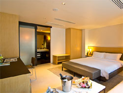 Dune Suite The modern fixture of black and grey interior suggests a casual yet elegant. The bathroom boasts spectacular dual shower heads and deep alongside a comforting bath tub. This suite renders an impression of a private luxurious residence, rather then just an ordinary hotel room. A wooden floor provides an utmost comfort. |