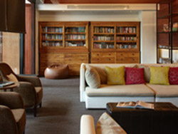 the Library features modern sofas and wing chairs, and cyber-desks fitted